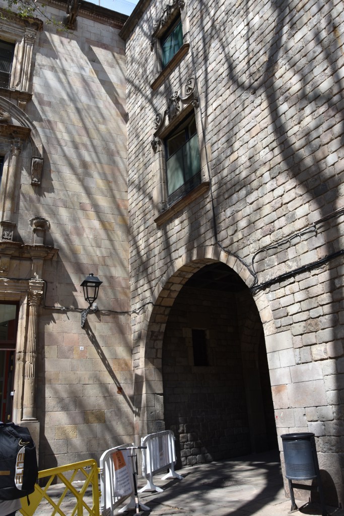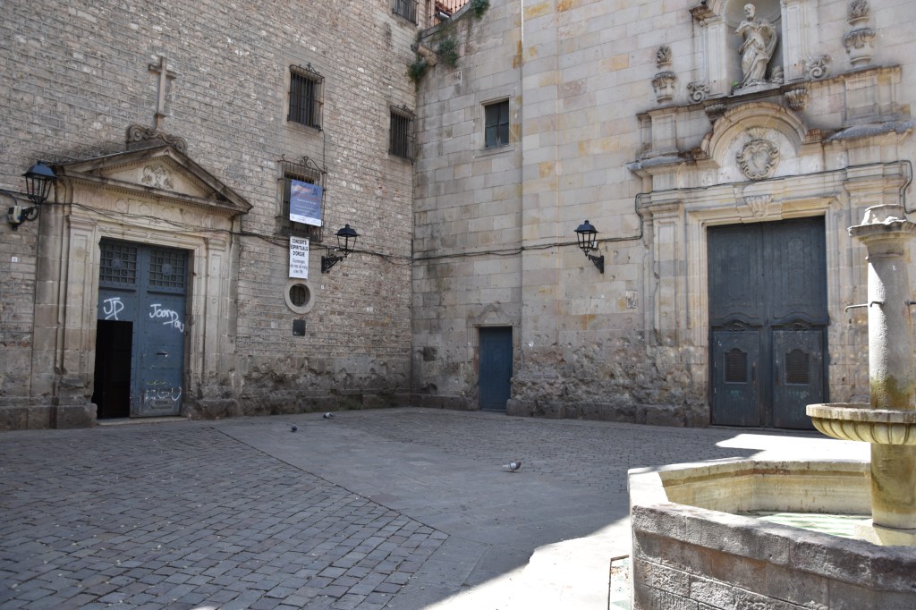 Para empezar, el edificio que se encuentra al lado de la iglesia, con un arco que encabeza el piso de encima de su puerta principal, no estaba allí. Este edificio era el del Gremio de Caldereros. Su ubicación inicial fue en la antigua calle de Boria, pero fue derribado para ampliar la Via Laietana a principios del Siglo XX. Del edificio original solo se conservó la fachada con el arco. Más tarde, esta misma fachada se ubicaría en 1911 en la Plaça Lesseps. Finalmente, en 1950, se le encontraría su ubicación actual en esta plaza.