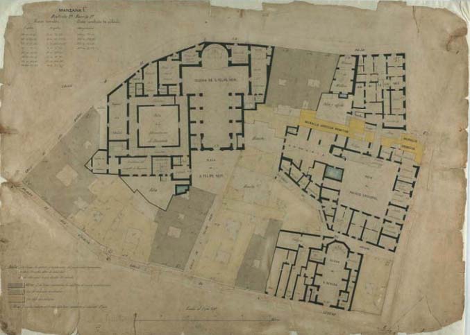 Como muestra, aquí se puede observar un plano del año 1862, donde se observa el tamaño de la pequeña plaza y la distribución original de los edificios.