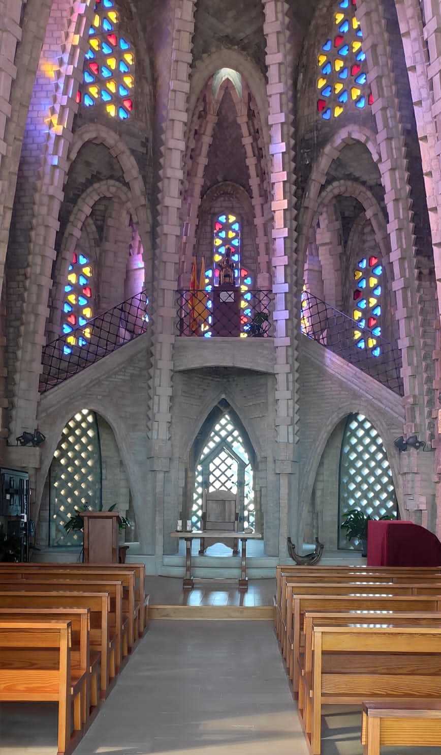 Justo al lado del Santuario encontramos unas escaleras que bajan que nos lleva a una pequeña cueva hecha por el mismo Jujol reutilizando material viejo. Por otro lado, también encontramos un campanario en la misma explanada del santuario, pero son dos edificaciones totalmente separadas y diferentes.
