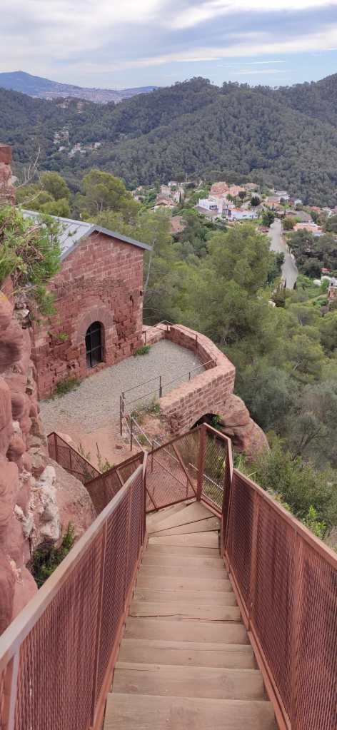Cuando hayamos visitado el castillo veremos que al final hay un caminito de escaleras y cuerdas que sigue hacia abajo y el cuál nos lleva a la iglesia de Santa María de Cervelló. Este caminito es un pelín complicado para niños pequeños y para gente que no esté acostumbrada a andar. Hay que tener en cuenta que para volver al coche tendremos que subir este mismo camino.