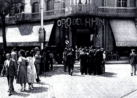 Inaugurado una hermosa tarde de mayo del año 1924, el establecimiento nació predestinado a coronar toda una época de la ciudad (ese mismo año aparecieron la olla a presión o la batidora túrmix para facilitar las tareas culinarias del futuro). El Oro del Rhin no sólo era un café, sino que también ofrecía servicio de restaurante, cervecería, charcutería y música en vivo (memorables fueron las noches en las que allí amenizaba la velada la orquesta del maestro Tolrà). En sus salones se reunieron intelectuales y artistas de la talla de Max Aub, Rafael Barradas, el crítico Sebastià Gasch o el poeta Federico García Lorca durante sus visitas a Barcelona. Y allí celebró la gran Margarita Xirgu su despedida de la ciudad, ya dispuesta a hacer las Américas.