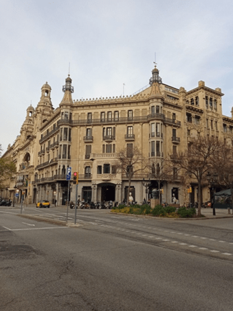 El tiempo apremia y, mientras cruzo la avenida observo, distraídamente, las dimensiones del edificio, admiro sus torres con miradores, las coloridas vidrieras, los arcos cegados, los fénix ígneos repetidos en las barandillas de los balcones, la ecléctica fauna desplegada por su fachada…toda esa fantasía romántica materializada en piedra. Y justo allí, me digo, bajo el cenador que mira a la Gran Vía, estaba el magnífico local.