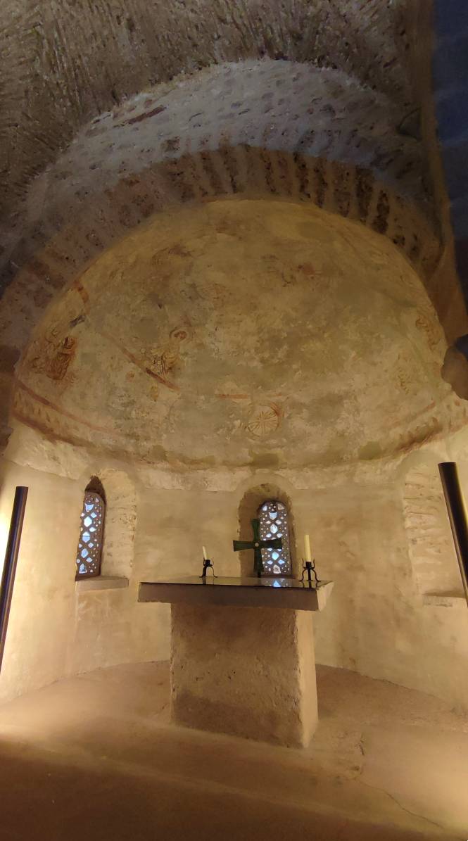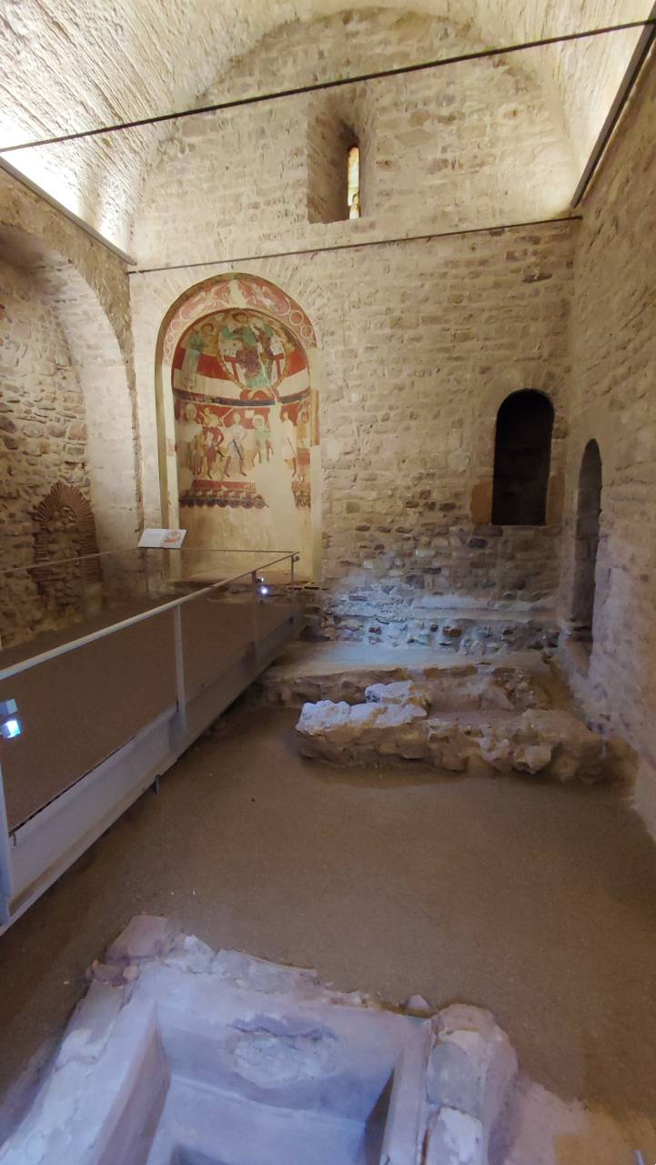 Pero cuando hablamos de la seu d’Ègara… ¡nos pareció espectacular!: no se trata de un edificio, sino de un conjunto monumental de iglesias románicas. Dicho de otro modo, aglutina tres preciosas iglesias románicas que, encima, son de la primera parte del románico (siglos V-VIII) y no son un puñado de piedras, están en muy buen estado. Las pinturas interiores, así como el conjunto, están en proceso de ser catalogadas por la UNESCO.