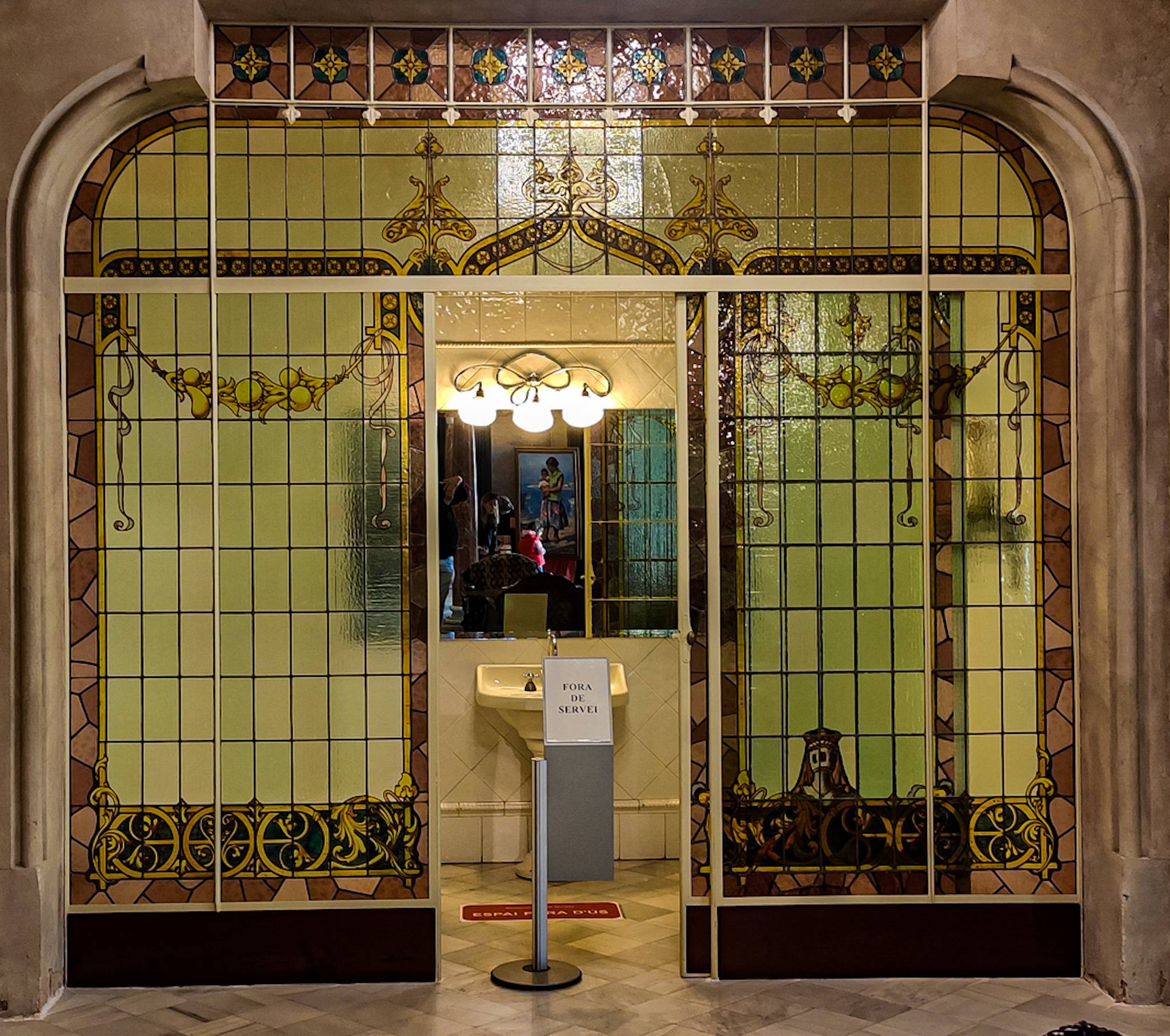 Los cristales de colores de la galería se unen a los del techo e incluso las puertas que dan al lavabo: es como ver una aplicación al cristal de color que no sea la ventana de una iglesia. Es un detalle modernista bastante usado en la época y que, en este caso, nos parece espectacular.