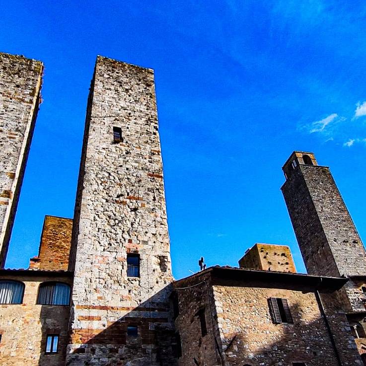 San Gimignano se encontró, pues, con la necesidad de defender esta zona y ser defendida de las múltiples rivalidades entre señores de la zona. Por ello, mandó construir las diversas torres que hoy hacen de ella ese skyline tan peculiar y que le han dado la etiqueta comercial del Nueva York de la Edad Media. Sin embargo, hoy conserva 15 torres, pero tuvo 72.