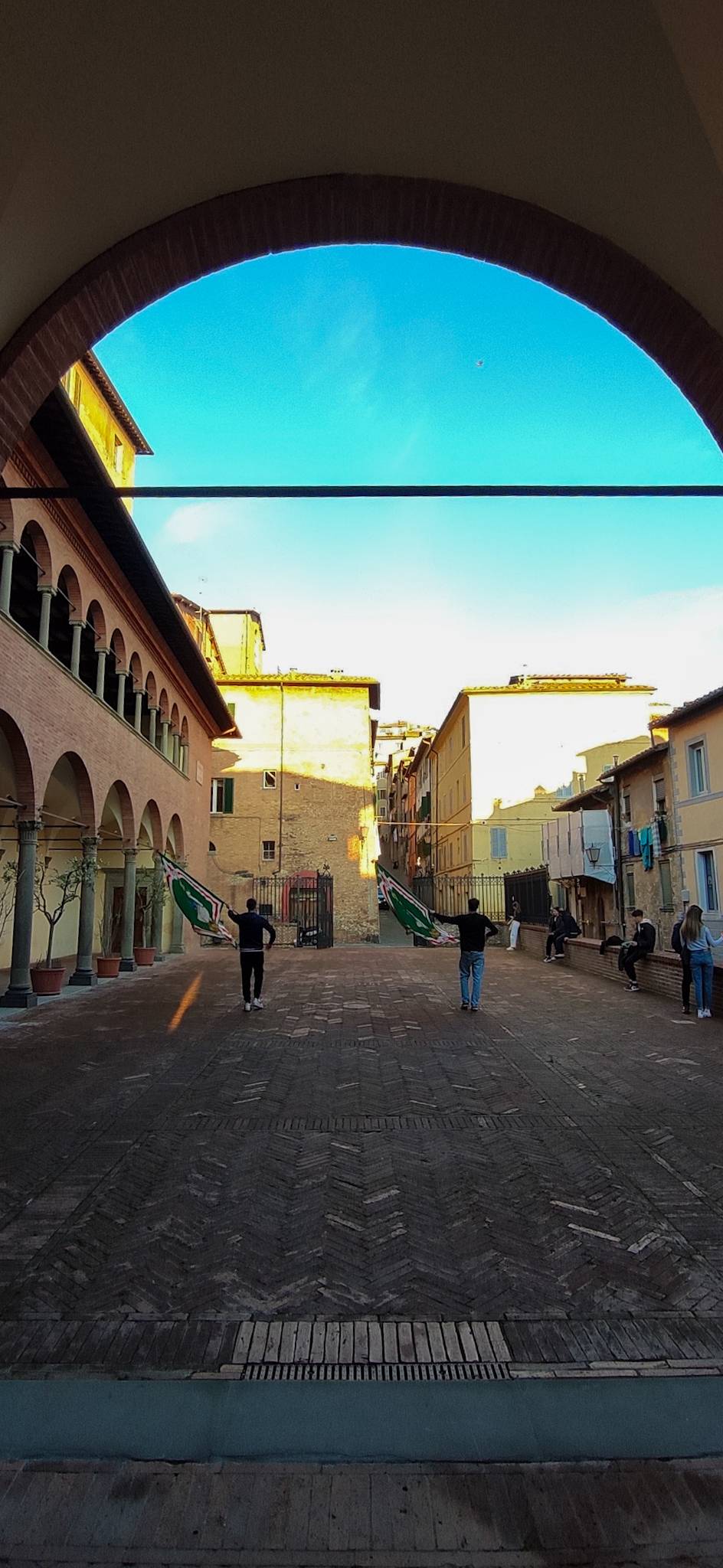 Impacta encontrar un espacio tan grande y diáfano en un centro tan medieval y denso como el de Siena. Sin embargo, el escenario es increibe: una plaza semicircular, con un ligero desnivel y con diferentes conjuntos monumentales como el Palazzo Público con su Torre del Mangia o la Fonte (fuente) Gaia.