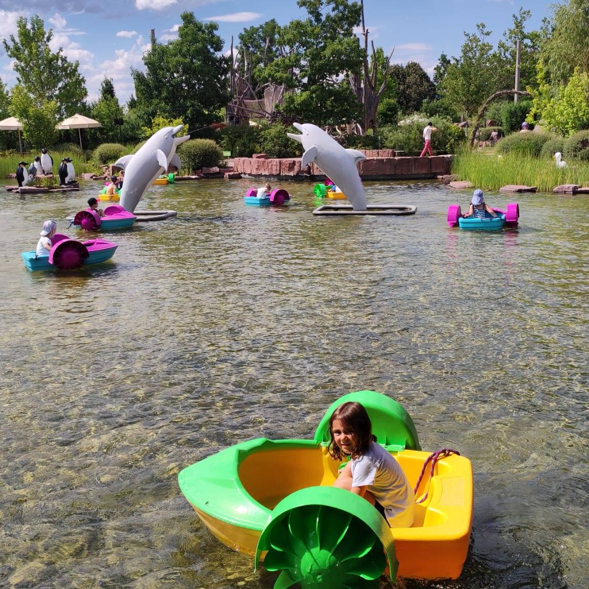 Al lado de los unicornios, un estanque con unas barcas de plástico nos hace pensar en el “City Life” de Playmobil. Allí, los niños y niñas mayores de 4 años pueden subir a las barcas solos y remar con una especie de doble mecanismo en plan rueda giratoria.