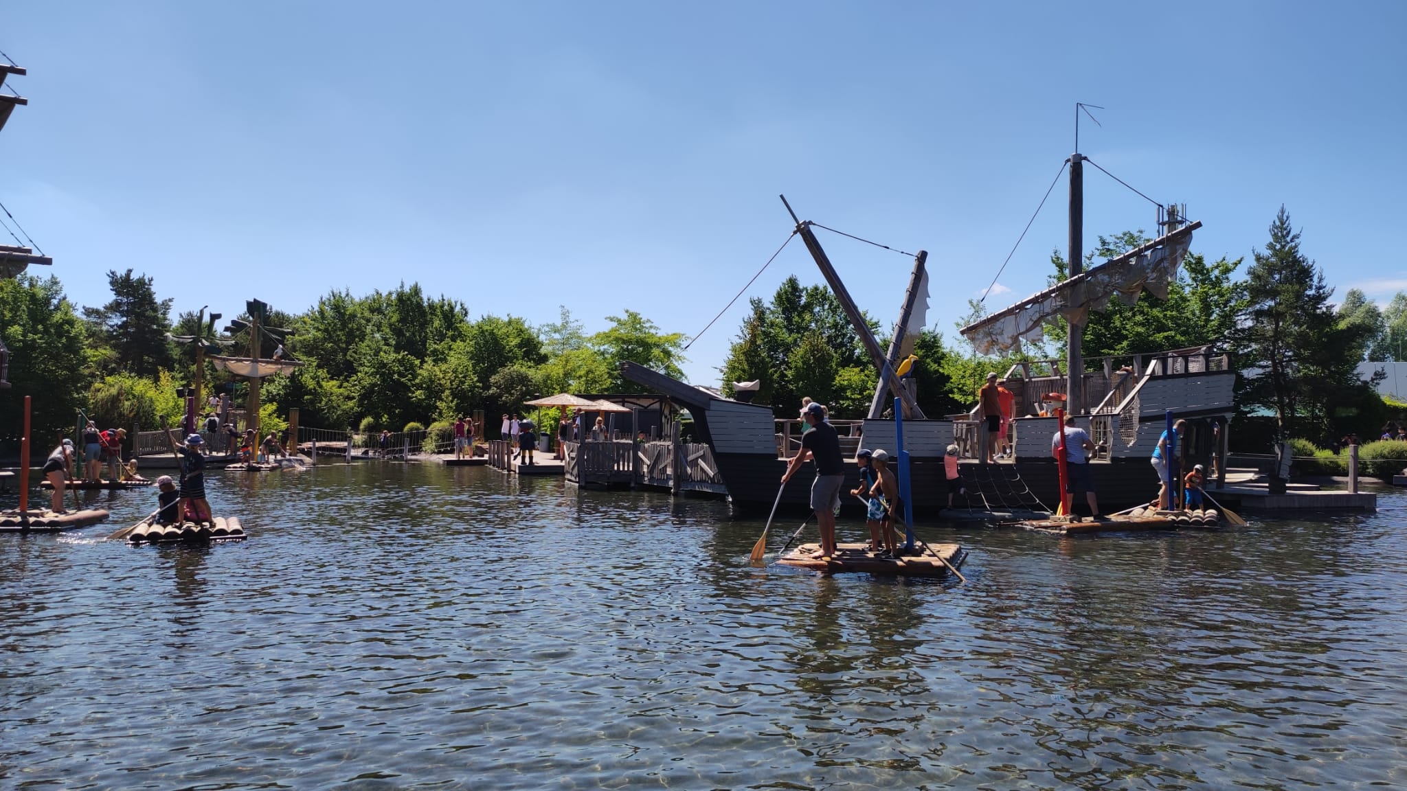 Encontraremos una zona de piratas, con unos barquitos en medio de un lago artificial que podemos llevar a remos o con un palo. En esa misma zona hay dos barcos pirata llenos de toboganes, redes para escalar, pisos que descubrir, cocinilla pirata, cofres, etc. Podemos acceder a los barcos de distintos modos, ya sea por la pasarela facilona o escalando por cosas más complicadas, dependiendo de lo “pirata” que sea nuestro hijo.