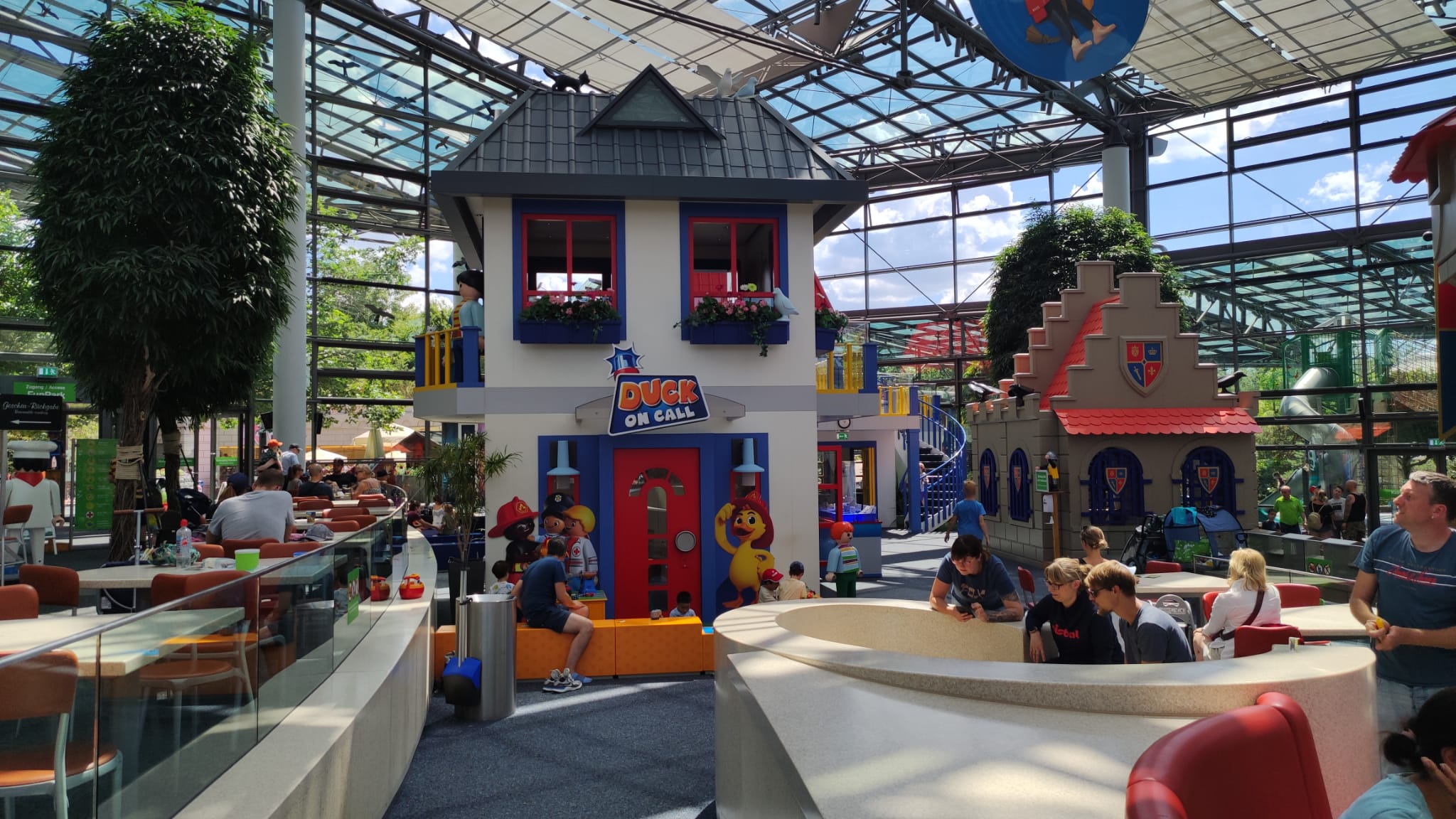 Ya os contamos que podéis llevar comida propia. Pero si optamos por comer, aunque hay diferentes chiringuitos repartidos, os recomendamos ir al edificio central. ¿Los motivos? Pues porqué la comida está bien y porqué disponemos de muchos espacios llenos de juguetes de Playmobil para que los niños se vuelvan locos jugando libremente.