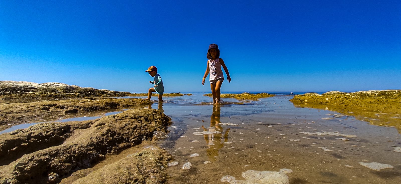 A parte, encontraremos donde se mezcla la arena con las rocas y en la cual podemos encontrar fauna marina como cangrejos, peces diversos e incluso bonitas medusas (desconocemos si son de las que pican). Os recomendamos ir con escarpines de playa, pues también detectamos peces araña. Pero, fuera de estos pequeños peligros, los niños se lo pasaron genial bañándose en estas tranquilas aguas.